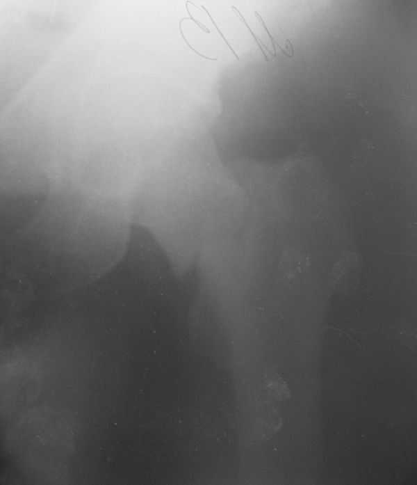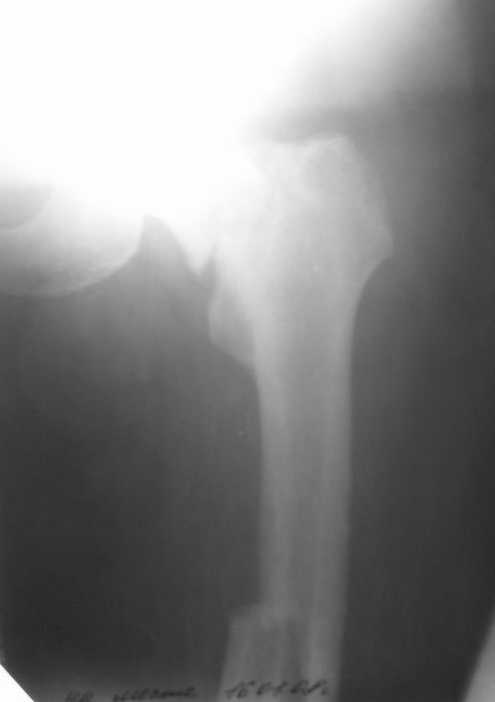 Заранее приношу извинения за качество снимков. То что есть - либо из ЦРБ, либо сделано в приемном покое, где дежурят рентгенлаборанты различной квалификации. Завтра постараемся сделать снимки всего бедра на длинные кассеты в 2 проекциях. Сейчас больной на скелетном вытяжении. Состояние стабильное.