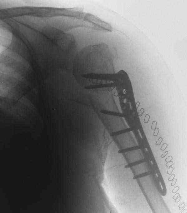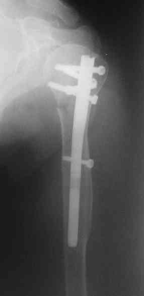 In the proximal humerus, the locking plate is generally introduced through an open incision of the type that I have used. The complex muscle attachments at the proximal end of the humerus, make it difficult to position the plate without opening.