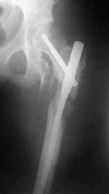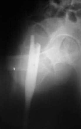 Мы закончили репозицию отломков бедренной кости в аппарате (рис. 1, 2) у нашей пациентки и на прошлой неделе сделали ей вторую операцию. Штифт удалось ввести закрыто. Верхний шеечный винт держался очень плохо, поэтому мы его убрали и решили не ставить. Нижний держал очень плотно. Рентгенограммы после операции прилагаю (рис. 3,4). Пока не получилось сделать нормальный аксиальный снимок (больная с трудом сгибает и отводит ногу в тазобедренном суставе). Пока сделали боковую проекцию в положении на здоровом боку со сгибанием здоровой ноги.