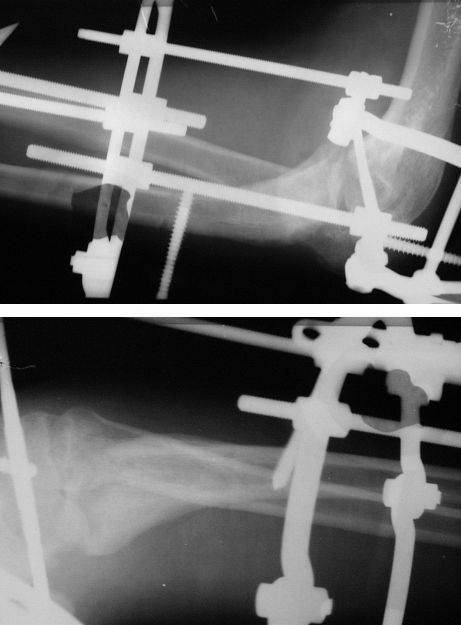 Коллеги! Сделан первый этап операции - синтез спице-стержневым аппаратом. При умеренной дистракции локтевого сустава (0,5 мм в сутки) производится дорзальная тракция дистального отломка локтевой кости (1 мм в сутки) стержнем Штеймана при стабилизации olecranon отдельным стержнем. Стержень в olecranon ввелся очень легко - остеопороз. Р-граммы через 4 дня после операции.