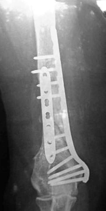 Преконтурированная длинная Locking пластина латерально и вторая под 90 градусов к ней, медиальнее сзади с достаточным количеством аутокости из крыла создаст нужную стабильность и условия для скорейшей разработки движения в суставе.