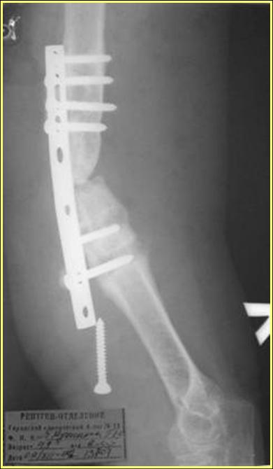 остеосинтеза, включая то, что в Кисловодске заезжим австралийским "кудесником" на ложный сустав уложена скорлупа от страусиновых яиц. Последняя операция одиноким локинг плейт в одной из клиник.