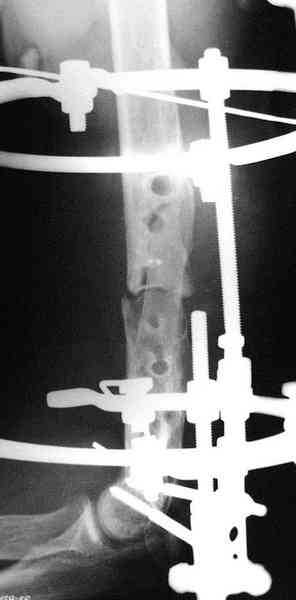 план доктора Волна на мой взгляд оптимален.Нами подобная тактика применялась только с коллапаном.Хочу обратить Ваше внимание на округлую тень мозоли в дистальном отделе.По моим многолетним наблюдениям и находкам так выглядят оставленные в ране салфетки-округлая мостовидная периостальная мозоль, огибающая инородное тело.