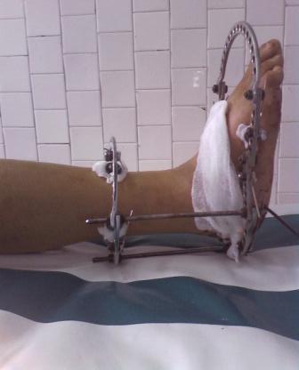 28.02.08г. произведен трехсуставной артродез таранно-пяточного, таранно-ладьевидного и пяточно-кубовидного суставов, с клиновидной остеотомией пяточной кости, с заполнением синуса костными осколками. Фиксация таранно-пяточный стягивающим винтом, таранно-ладьевидный и пяточно-кубовидный спицами, варусная деформация стопы устранена. Для наблюдения за состоянием раны и стопы а также для фиксации и поддержания напряжения произведен к/остеосинтез аппаратом Илизарова.