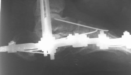 28.02.08г. произведен трехсуставной артродез таранно-пяточного, таранно-ладьевидного и пяточно-кубовидного суставов, с клиновидной остеотомией пяточной кости, с заполнением синуса костными осколками. Фиксация таранно-пяточный стягивающим винтом, таранно-ладьевидный и пяточно-кубовидный спицами, варусная деформация стопы устранена. Для наблюдения за состоянием раны и стопы а также для фиксации и поддержания напряжения произведен к/остеосинтез аппаратом Илизарова.
