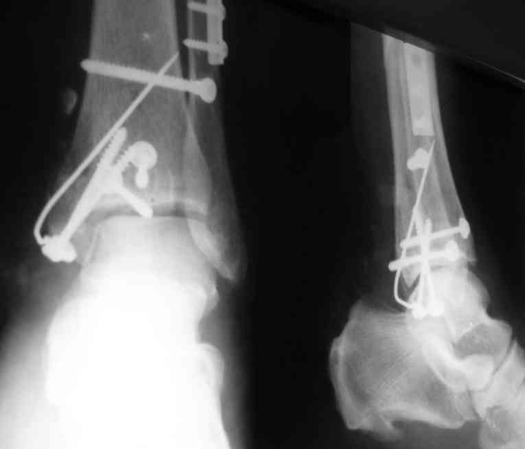 Не очень удачный вариант остеосинтеза: сохранен подвывих стопы, синдесмоз не достаточно репонирован. Думаю, в данном случае у пациента д-з: остеоартрит правого голеностопного сустава, послеоперационный остеомиелит правой голени. Предлагаю тактику: одномоментно выполнить удаление металлоконструкции, хирургическую обработку очага остеомиелита, резекцию голеностопного сустава, артродез аппаратом. Другие методы лечения не привидут к купированию гнойного процесса. Так как полость сустава в настоящее время имеет вид пиогенной капсулы, в которой будет поддерживаться гнойный процесс даже после заживления свища, с последующим его открытием и опорожнением гноя.