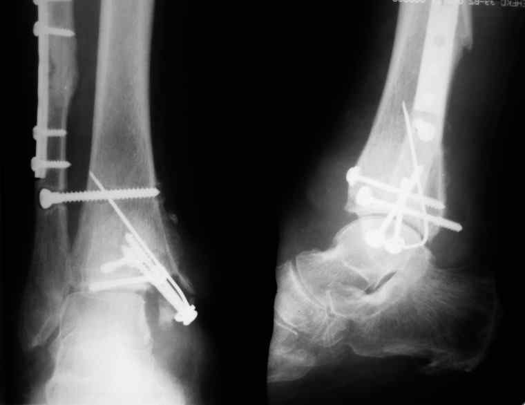 Несросшийся перелом внутренней лодыжки и даже ложный сустав там же ,обычно, не может быть серьезной проблемой для пациента, при условии сохранности дистального синдесмоза. Но остеомиелит? и нет ли там остеоартрита голеностопного сустава? Если там имеется свищ, то попробуйте ввести в него контраст (прим. - урографин) и выполнить Rg в 2х пр. Жду дополнительную информацию. С уважением.