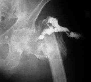 В вертлужную полость устанавливается цемент и головкой протеза выдавливается выемка, т.е. создается место для головки. В проксимальное бедро устанавливается заранее подготовленный цементный бедренный компонент.
