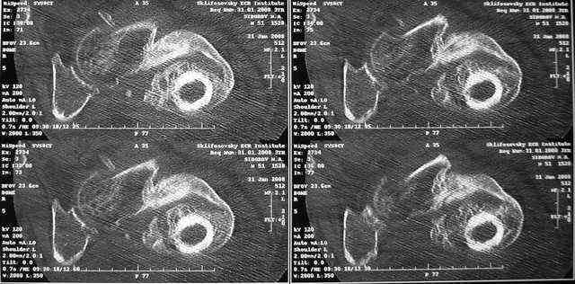 Очень признателен Вам за ответ, но позвольте мне не согласиться с Вами. Я бы пока не делал вывод о анкилозировании тазобедренного сустава. На рентгеновских снимках, да и по данным компьютерной томографии (а этот метод один из самых современных и информативных), хорошо прослеживается постоянной ширины щель между головкой бедренной кости и вертлужной впадины. Кроме того, несложно увидеть разницу "шеечно-диафизарного угла" до и после выполнения тракции в аппарате. Хотя, Алексей, даже если я и прав, это не сильно облегчает нашу задачу.