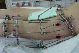 Кстати, если тазобедренный сустав безнадежно потерян, то можно по выведении длины и оси зафиксировать в аппарате дистальный отломок и только левую половину таза, освободив правую.