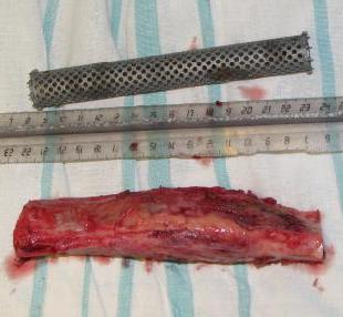 Исходя из диагноза, выглядела адекватной сегментарная резекция, которая дает наименьшее количество рецидивов. Напомню, пациентке 61 год, она еще практически слепая, т.е. функциональные потребности невысокие. Больную положили к нам в отделение. Заказали кейдж в МАТИ (посодействовал Анатолий Федорович Лазарев, ему огромное спасибо), его быстро сделали. На этой неделе состоялась операция - сделали сегментарную резекцию единым блоком. Кортикальная пластинка вроде не не была нигде прорвана, хотя местами сильно истончена. Пока делали остеосинтез, препарат успели отправить в лабораторию, так что распилить получилось только на следующий день. При его рассмотрении с рентгенологом и морфологом сошлись, что это не фиброзная дисплазия, что было первым предположением по рентгенограммам. В полости было и мягкотканое образование. Окончательно заключение дадут через несколько дней. Будем признательны за комментарии и критику.