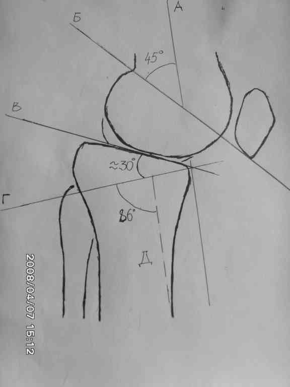 1- При сгибание коленного сустава на 30гр. линия Blumensaat пересекается с осью бедра под углом 45гр.