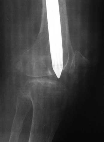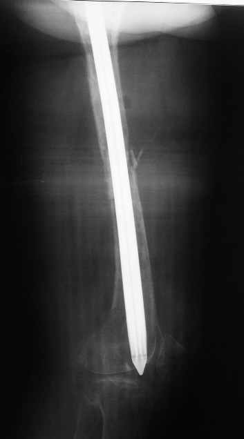 По просьбе коллег выношу на обсуждение следущий случай лечения перелома бедра, о дальнейшем лечении больной 48 лет с РПА. Анамнез: В 2005 году в ЦРБ - остеосинтез перелома бедра пластиной. В 2007 г. воспаление в ср. трети бедра и удаление пластины. Через 2 мес. - рефрактура и фиксация гвоздем "фикшн". Через 2 мес. после синтеза - свищ, "функционирующий" по настоящее время. Что делать? Если бы вопрос задавался лично мне, то я бы предложил удаление существующего фиксатора, санацию костномозгового канала, установку спейсера на тонком сплошном титановом гвозде с последущей заменой на полноценный сплошной титановый гвоздь.Правда, что делать с отверстием в колено, вернее как провести санацию так чтобы минимизировать риск распространения инфекции в коленный сустав, представляется не очень четко. Необходимую для обсуждения дополнительную информацию предоставлю по мере возможности.Спасибо.