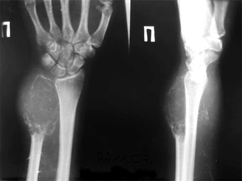 Была 2 мес. назад больная с той же опухолью той же локализаци. Тех же примерно размеров. Мистика какя-то :-) Сделал резекцию, опухоль убрал с мягкими тканями, удалось убрать, не нарушив ее. Локтевую артерию легировал. Электроабляция с фанатизмом. Гипсовая иммобилизация 4 нед, затем - разработка. Больная постоянно носит фиксатор лучезапястного сустава. Работает компьютерщиком. Довольна. А еще б ей не быть довольной, если онкологи, которые к нам ее послали, однозначно приговорили ампутацию:-)