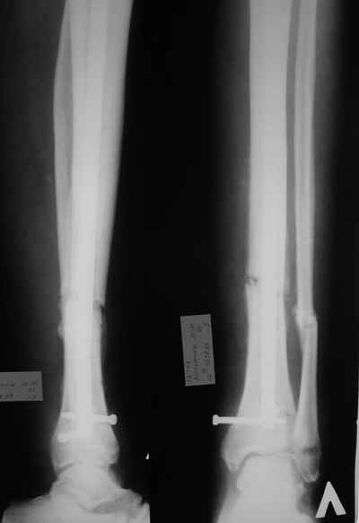 Итак - удалили стержень, воспалительный процесс к тому моменту купирован, наложили кастовую повязку и в течение 3 месяцев на контрольных рентгенограммах - признаки консолидации. Уже в сентябре, т.е черз 5 месяцев после нагноения пациент вернувшиь с подвождной охоты привез здорового сазана - основная жалоба - ноги побаливают после длительного лпаваня в ластах. Прилагаю снимки через год после удаления стержня. Вот такая, на этот раз счастливая казуистика.