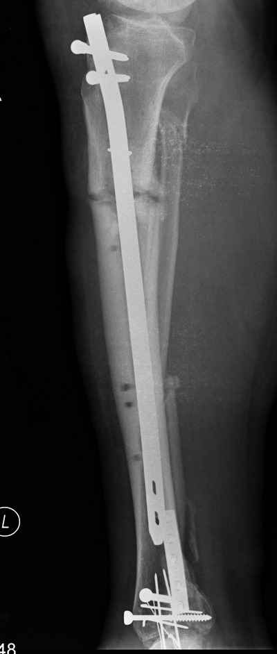 На третьем этапе - ещё через 3-4 недели , в случае если нет признаков инфекции выполняем остеотомию большеберцовой кости для восстановления длины сегмента в случае, острого укорочения, или костного транспорта для восстановления деффекта.