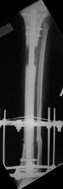 На втором этапе - через 3-4 недели выполнить повторный дебридемент,адаптировать хорошо концы отломков, удалить все остальные внутренние фиксаторы,убрать участок м/б кости, наложить аппарат Илизарова и сделать острое укорочение.Аппарат должен быть очень стабьльный. Если удастся на проксимальный фрагмент наложите 2 кольца, 5 спиц. Или одно кольцо с 3 спицами и 2-мя стержнями Шанца. И 2 кольца на дистальный фрагмент. Имейте ввиду, что острое укорочение вызывает гофрирование мягких тканей и может привести к нарушению кровообращения. Поэтому в случае исчезновения пульса на артерих стопы, необходимо проверить доплер сигнал. Есоли есть доплер сигнал, сосудистые нарушения ограничиваються спазмом, что очень часто при таких операциях!!! Если доплер сигнала нет, надо вернуть частично длину назад, оставив при этом некоторое растояние между отломками. В послеоперационном периоде продолжаем антибиотики.