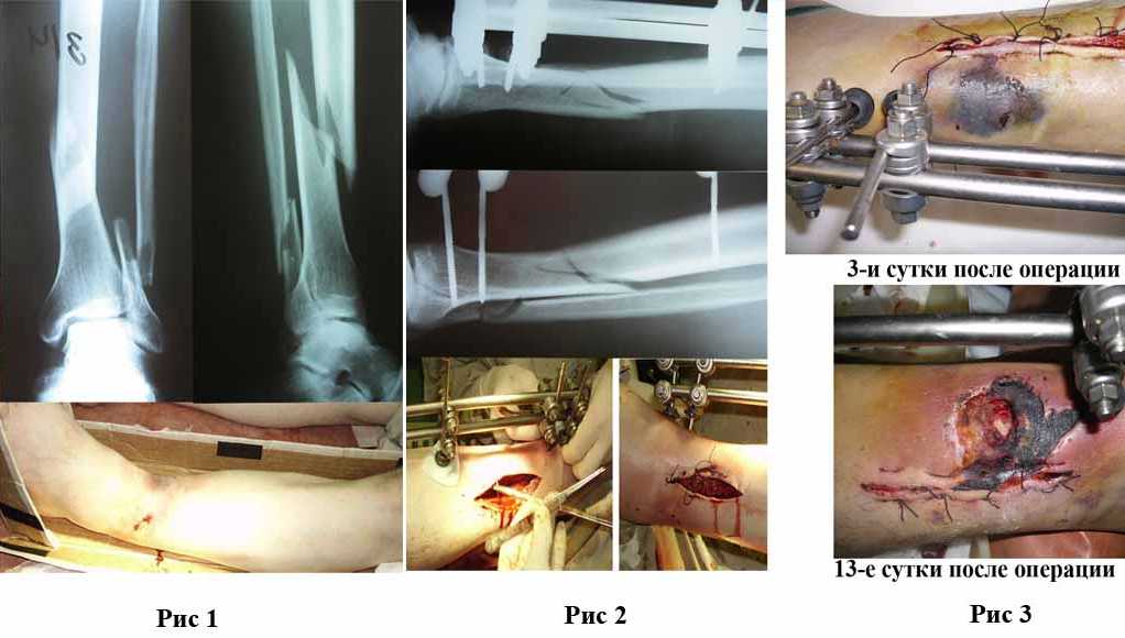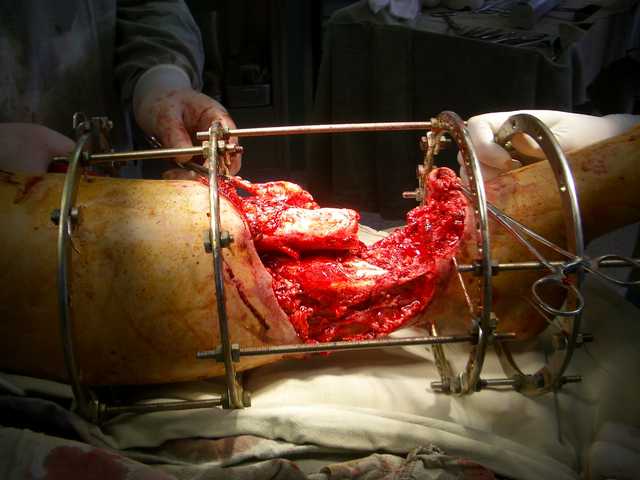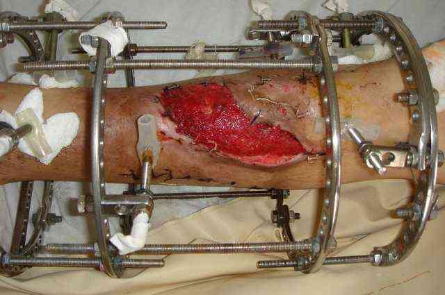 Огнестрельный дефект костей и передней группы мышц, поступил с юнилатеральным аппаратом, стабильность плохая, из раны обильное гнойное