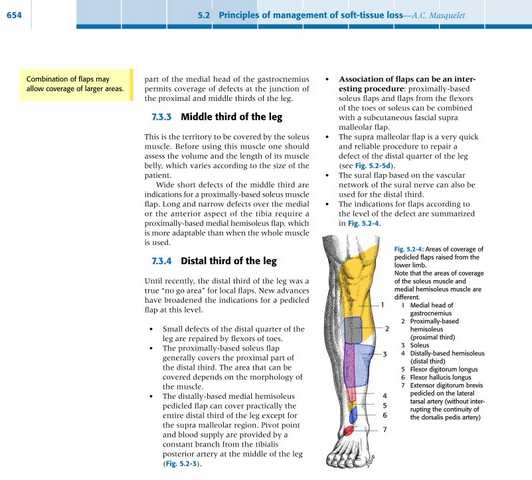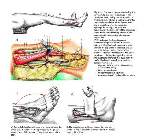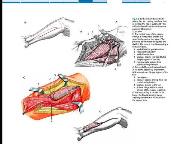 Если поблизости нет микрохирургов - то можно сделать пластику лоскутом камбаловидной мышцы (distaly based hemisoleus) или латеральным надлодыжечным лоскутом (lateral supra malleolar flap, его минус в том что он не имеет мышечного компонента). У меня нет иллюстрации по закрытию камбаловидной мышцей на данном низком уровне - нижняя треть голени (хотя о локализации раны трудно судить из приведенных иллюстраций), но на уровне средней трети голени мы имеем около десятка операций с очень хорошим результатом (рис. 5, 6, 7).