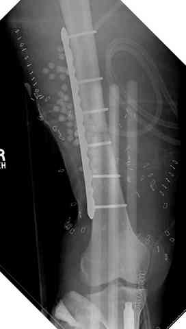здесь случай с политравмой, перелом зафиксирован наружным фиксатором, после третьей irrigation&debridment фиксация бедра пластиной с последующей кожной пластикой.