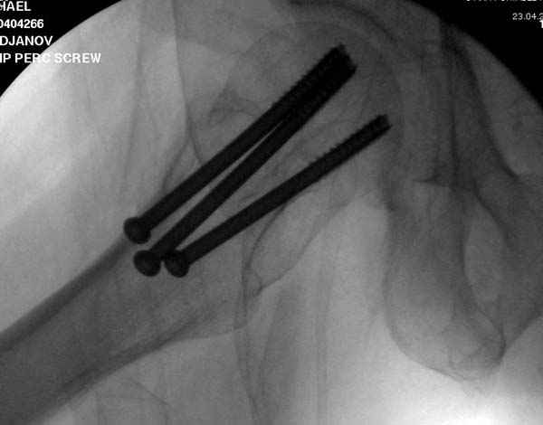 Профилактику дальнейшего раскола неполного перелома шейки провели тремя канюлированными шурупами.