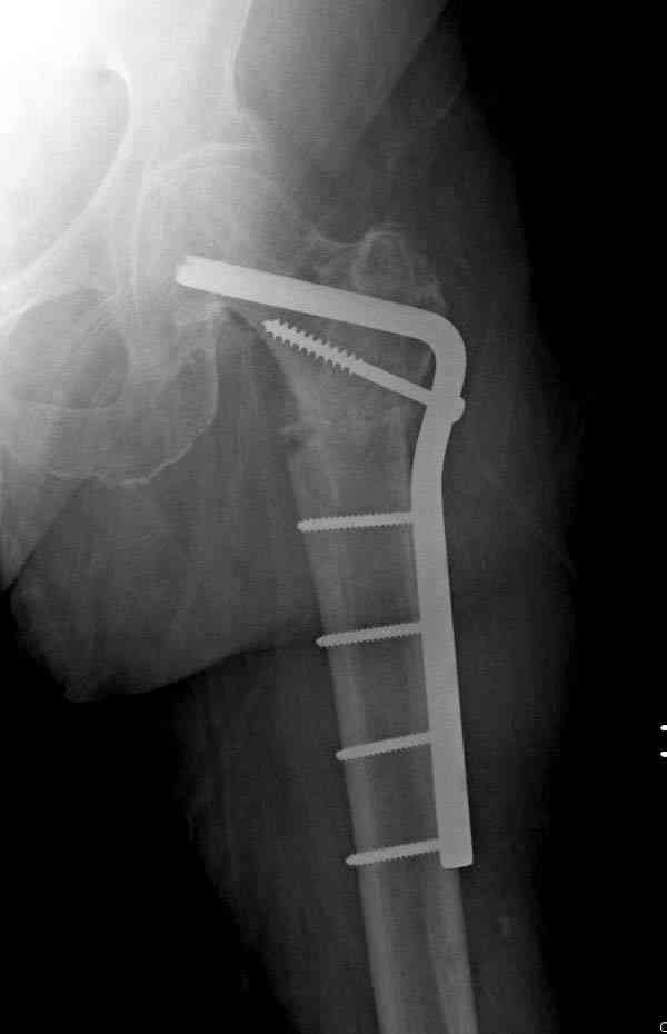 Г-образная пластина в 90 градусов неплохой вариант, но тогда за счет компрессии укорочение будет прогрессировать.