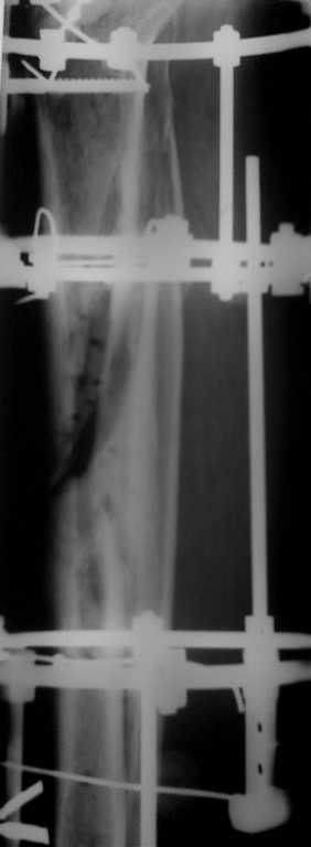 Если нет возможности направить пациента на микрососудистую пластику или другое дорогостоящее вмешательство, рассмотрите вариант обширной резекции некротизированной кости с последующим закрыитем мягкотканной гранулирующей раны расщепленным трансплантатом. При сохраненной аппаратом длине голени подтяните оба фрагмента большеберцовой кости к фибуле и дождитесь консолидации. в дальнейшем пусть ходит с ортезом до перестройки фибулы, это все-же лучше протеза.