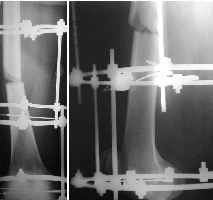 Hi looking at pictures i thimk that the ilizarov frame can give union at the fracture site in shaft may be with compression /+/- bone grafting .we have two options