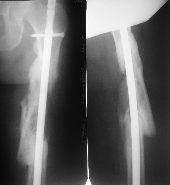 Мы бы не стали открывать, такие переломы срастаются, хотя бы и с краевым дефектом. То есть если удалять стержень потом, то сильно попозже обычного. В приложении пример. Сразу после операции и через 11 мес. Понятное дело, пациент к тому времени давно и не хромал, и функция колена была полная.