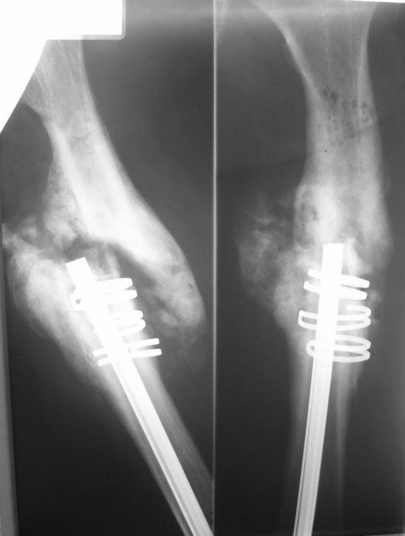 В декабре 2006г политравма в результате ДТП,соп.дз: Закрытый винтообразный оскольчатый перелом с/з правого бедра. Выполнена открытая репозиция, остеосинтез гвоздем Кюнчера + кольца NiTi. Через 15мес штифт сломался, был наложен АВФ, осложнением которого явился остеомиелит бедренной кости.