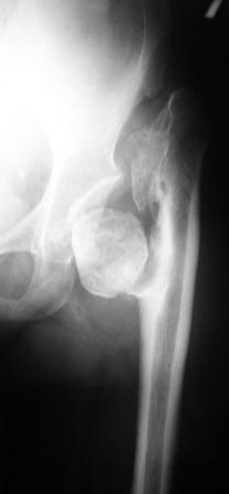 удлинение в аппарате Илизаровна 5см. В настоящее время укорочения конечности нет. Обратилась по поводу выраженного болевого синдрома, который усилился в течение последних двух лет. Судя по рентгенограммам - имел место coxa vara coli lisis с патологическим вывихом бедра.