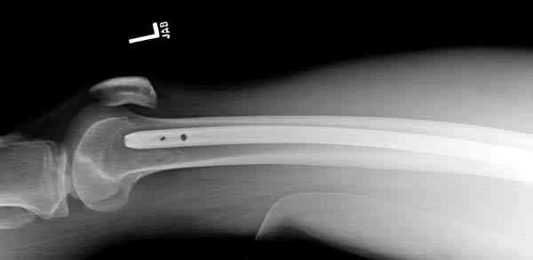 Соображения общего характера, пока снимков нет. Нет разницы, ретро- или антеградно штифтовать. Конечно, мощный гвоздь с толстыми винтами при наличии краевого дефекта достаточен. Если же дефект в итоге все-таки окажется сегментарным, винты рано или поздно сломаются.