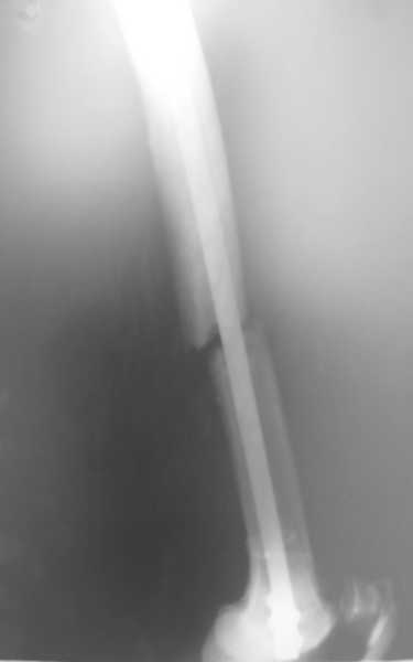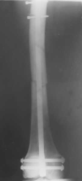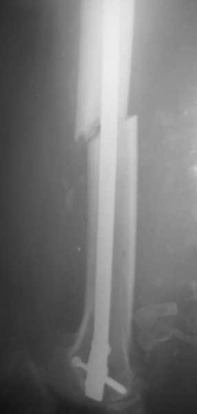 2. какой был штифт (с комрессирующей системой или без)? Гвоздь ставился без рассверливания? Были проблемы с проксимальным блокированием (нижний винт)? Нет ли у больного сильно избыточной массы тела?