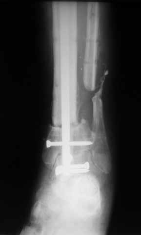 К сожалению, ни в одном из этих 3-х случаев мы не получили удовлетворяющего нас результата. Очень трудно провести штифт, введенный антеградно ровно по центру таранной кости. Отсутствие подвижности между диафизом и дистальным отломком большеберцовой кости (после фиксации в аппарате в течение 1-2 мес) очень усложняет проведение штифта в центр блока таранной кости. Поэтому мы от этого пока отказались, и проводим штифт через пятку. При данном варианте фиксации подобных проблем не возникало ни разу.