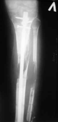 Уважаемые коллеги! В принципе у Вас есть еще время решить дальнейшую тактику, но у меня вопрос: почему остеотомия малоберцовой кости произведена на уровне перелома б/б кости?