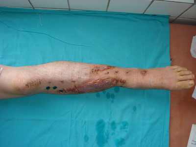 А.Н. - Еще один интересный момент. Обычно по переднее-внутренней поверхности голени нет сухожилий. Но доктора говорят, что дном раны является сухожилие. Интересно, сухожилие какой мышцы у этого пациента сместилось из другой области и выстоит в рану?