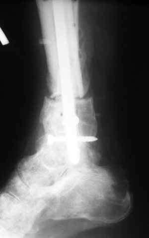 И еще. Если доктора решат делать артродез, то при артродезировании штифтом через пятку особых проблем с нестабильностью дистального отломка большеберцовой кости не возникает. Даже при том обстоятельстве, что уже где-то через месяц после операции пациент ходит почти с полной нагрузкой на ногу. Такого рода проблемы чаще бывают при лечении спице-стержневым аппаратом. Переломы в нижней трети голени в аппаратах частенько срастаются с большой неохотой. Правда в этой ситуации наша совесть абсолютно чиста - мы не повреждаем таранно-пяточный сустав. Пока лежит аппарат этот сустав приходит в полную негодность самостоятельно, всего лишь за 4-6 месяцев.