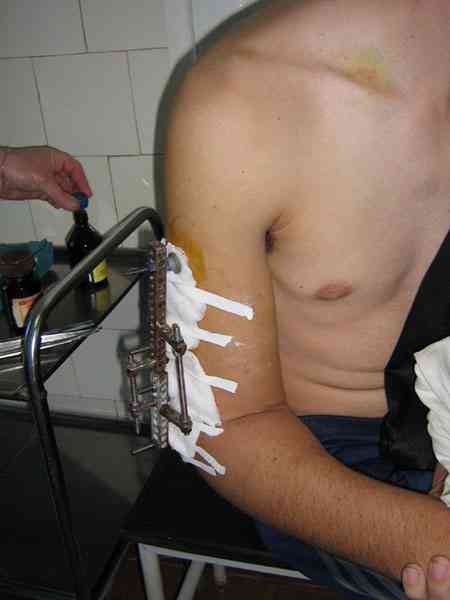 Уважаемый Ерсин! Предлагаю пойти на резекцию ложного сустава наружным доступом, репозицию отломков с последующей костной пластикой, под визуальным контролем наложить чрескостный стержневой одноплоскостной аппарат (четырех стержневой)во фронтальной плоскости. Костный трансплант необходимо фиксировать спицами Киршнера. После монтажа аппарат и фиксации транспланта -- ушивание раны. Помните -- во время операции будут трудности с лучевым нервом.