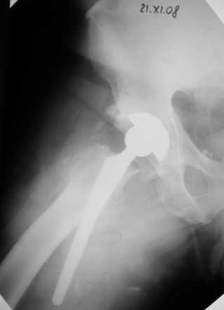 Думаю ножка прихватилась, и при удалении вокруг нее надо будет аккуратно пройти узким тонким долотом. Высока вероятность удаления без раскола, но и к этому следует готовиться. Может циркляжик привентивно наложить. Если удаляться не будет, то можно пилой пройти вдоль большого вертела до ножки и чуть развести пропил дллотом. Ножку ВЫ извлечете уже без гидроксиапатитного покрытия.