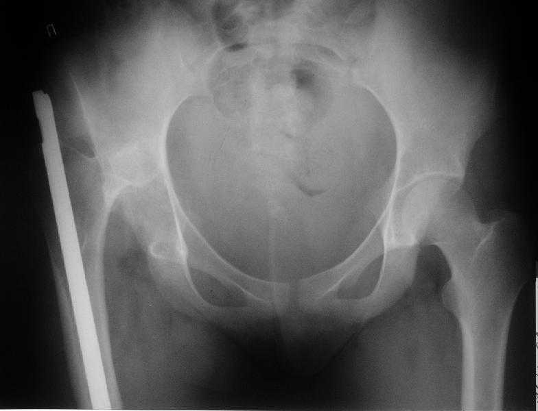 Здравствуйте уважаемые коллеги.Больная 18 лет. Травма 12.08.2007. Лечилась в одном из городов Свердловской области. 15.08.2007 в ЦРБ сделан открытый остеосинтез правого бедра интрамедуллярным стержнем, после чего была наложена гипсовая кокситная повязка и пациентка лечилась амбулаторно в течение 1,5 месяцев. На контрольном Rn исследовании в марте 2008 диагностирован подвздошный вывих правого бедра.
