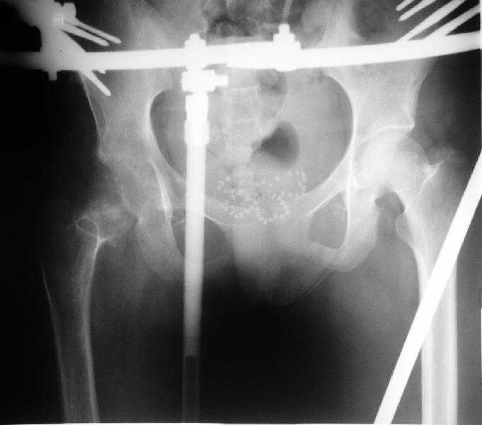 Поступила к нам в отделение. В отделении первым этапом был наложен аппарат внешней фиксации для низведения бедра. 30.09.08 интрамедуллярный стержень удален. Вторым этапом планируется эндопротезирование. В настоящее время у больной имеется контрактура коленного сустава, с амплитудой движений в пределах 30 градусов., и выраженный остеопороз вертлужной впадины и проксимального отдела бедра. Больныя пердвигается самостоятельно с опорой на здоровую ногу и костыли.