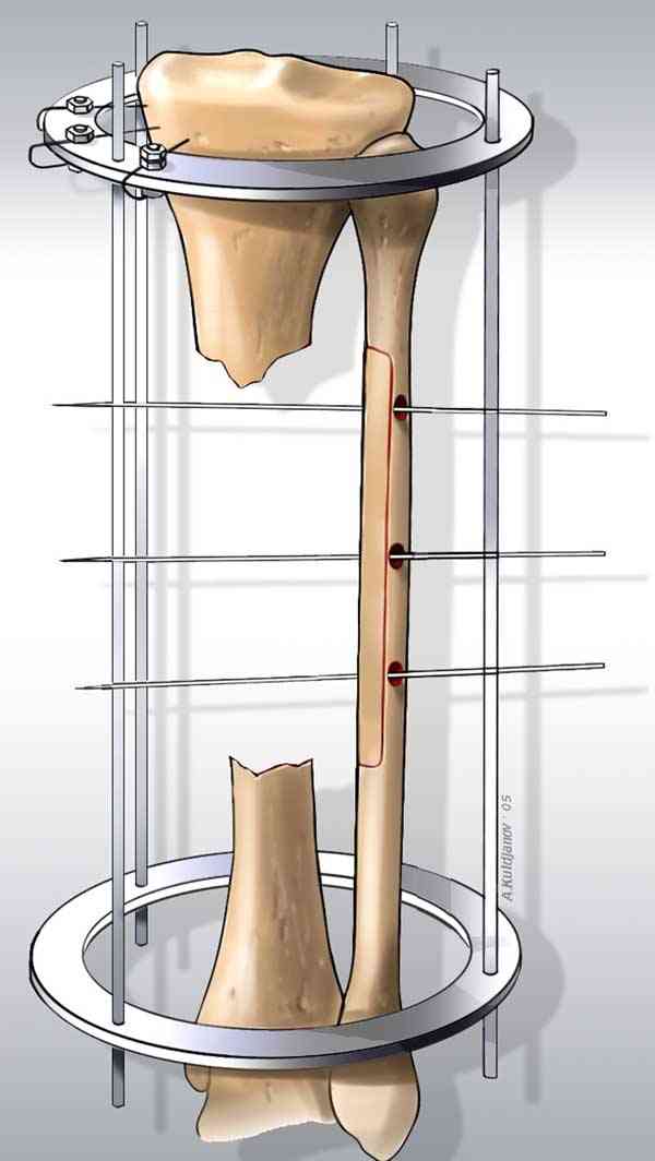 Недостаток костной массы можно заместить расширением малоберцовой. На небольшое расстояние можно передвинуть медиальный кортекс малоберцовой в аппарате. Отрицательным моментом техники является продольная остеотомия малоберцовой.