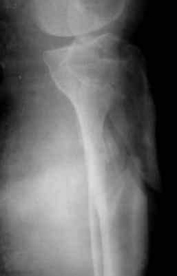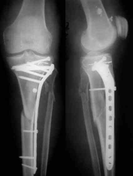 Для метадиафизарной части этого повреждения обнажение перелома с анатомичной репозицией не является абсолютно необходимым, и, более того, неизбежно приведёт к деваскуляризации кости и возможным проблемам с заживлением перелома. Для этой части перелома желательно шинирование без обнажения зоны перелома. Шинирование может быть интрамедуллярным соответствующим гвоздём или экстрамедуллярным (пластиной или аппаратом внешней фиксации). Главное для метадиафизарной части перелома - это восстановление длины, оси конечности с правильной ротационной установкой и достижением относительной стабильности.