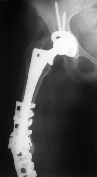 Female, rheumatoid, THA in 2003, car accident in 2006, failed plating. Nailing in Oct 2007. The nail is solid with hollow proximal part where the stem is docked. Last images are in 1 year after