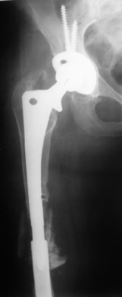 KE> in remnant of intact proof proximal femur), and new long stem,