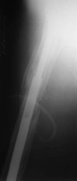 Спасибо за обсуждение. После нескольких дней тракции аппаратом сделали. Попытка закрытой репозиции не удалась из-за смещения по ширине, мешали фрагменты цемента. После их удаления репозиция получилась. Еще убрали немного цемента с ножки по латерльной стороне, чтобы обнажить 40-50 мм ее дистальной части, для плотной посадки гвоздя. Дальнейшее введение гвоздя было несложным. Протез показался нам стабильным в проксимальной части как латерально, так и медиально. Картинки в приложении.