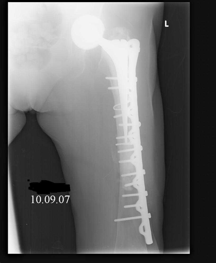 Female, rheumatoid, THA in 2003, car accident in 2006, failed plating. Nailing in Oct 2007. The nail is solid with hollow proximal part where the stem is docked. Last images are in 1 year after