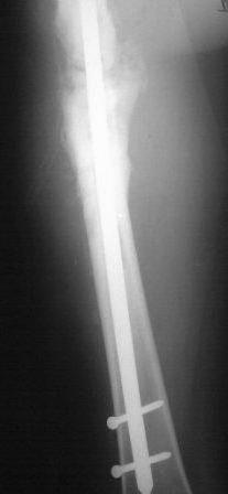 Спасибо! Для рассверливания канала предварительно из зоны перелома выполнили перфорацию сверлом диаметром 6 мм, т.к. на протяжении практически 10-12 см в зане перелома склерозированная кость с кистозными полостями. Из зоны перелома были удалены рубцовые плотные ткани. Окончательно формировали каналя с использованием полугибких риммеров. Канал рассверлили до 10 номера, гвоздь № 9 длиной 380 мм. Посев из зоны оперативного вмешательства отрицательный. Для контроля 3 суток назад посеяли отделяемое по дроенажу (геморрагическое). Дренаж удалили на 3-и сутки. насегодняшний день 6 сутки, заживление первичное. По окончании установки гвоздя в канал осуществили компрессию до уровня плотного соприкостновения костных отломков, после чего длокирование гвоздя. Визуально есть участок около 1,5-2 см где гвоздь визуализируется, но вспоминая длительный остемиелит от допонительного использования трансплантатов отказались.