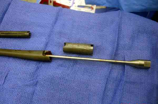 Приспособление для удаления сломанных штифтов и наличие ЭОП облегчит задачу. При отсутствии крючка тогда можно применить обычный длинный ball pointed guide wire от интрамедулярного набора. Проволока, пропущенная за пределы гвоздя и зажатая другая вытащат сломанный конец штифта без проблем.
