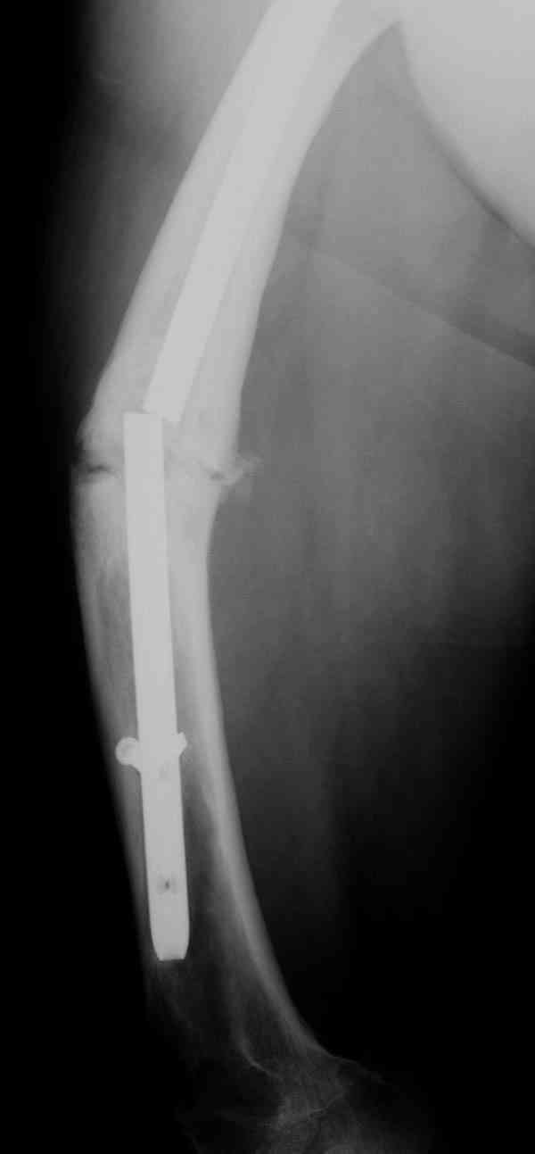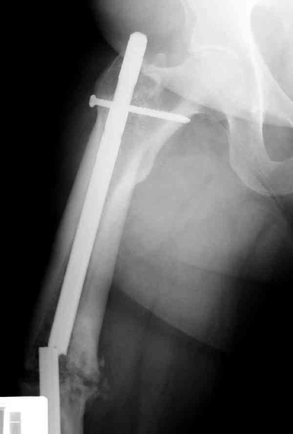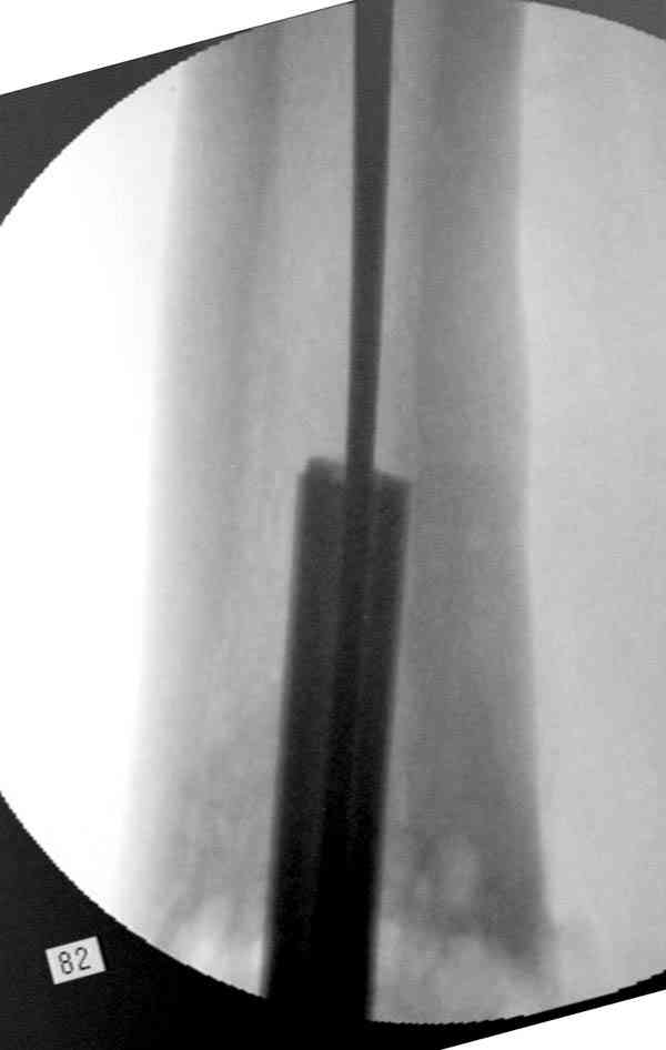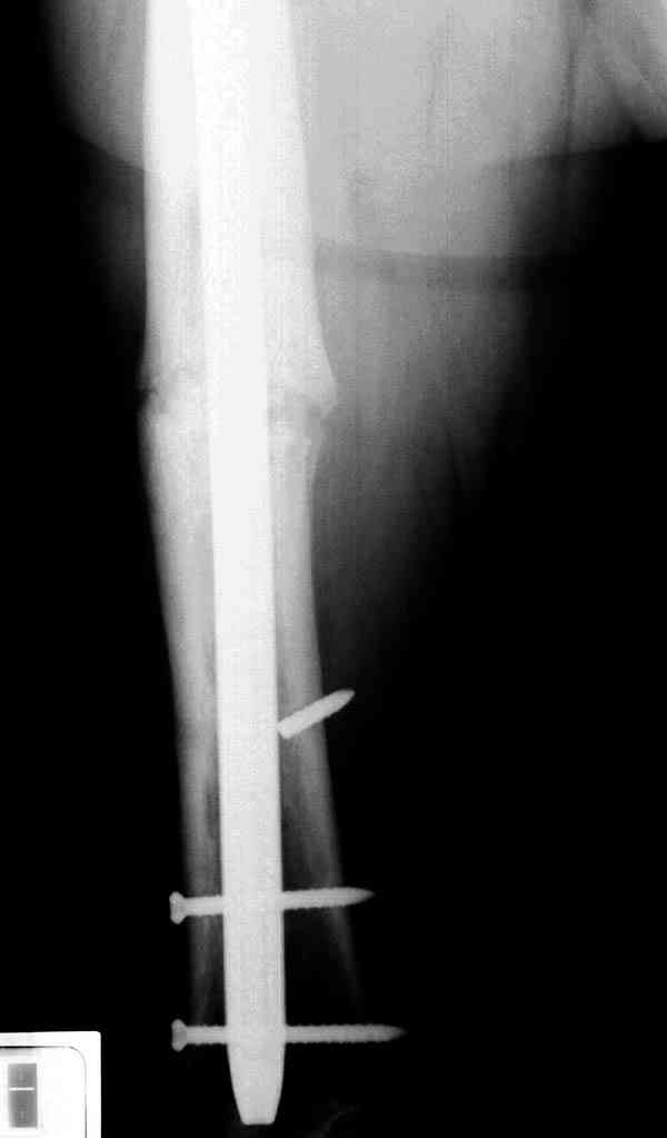 Сросшаяся малоберцовая как распорка привела к образованию ложного сустава. В таких случаях удаляем сломанный штифт и проводим стимуляцию ложного сустава рассверливанием. Рассверливание канала создает стимуляцию на месте ложного сустава, и динамический вариант блокировки штифта с большим диаметром создаст стабильность. Ранняя нагрузка после остеотомии малоберцовой приведет к сращению ложного сустава.